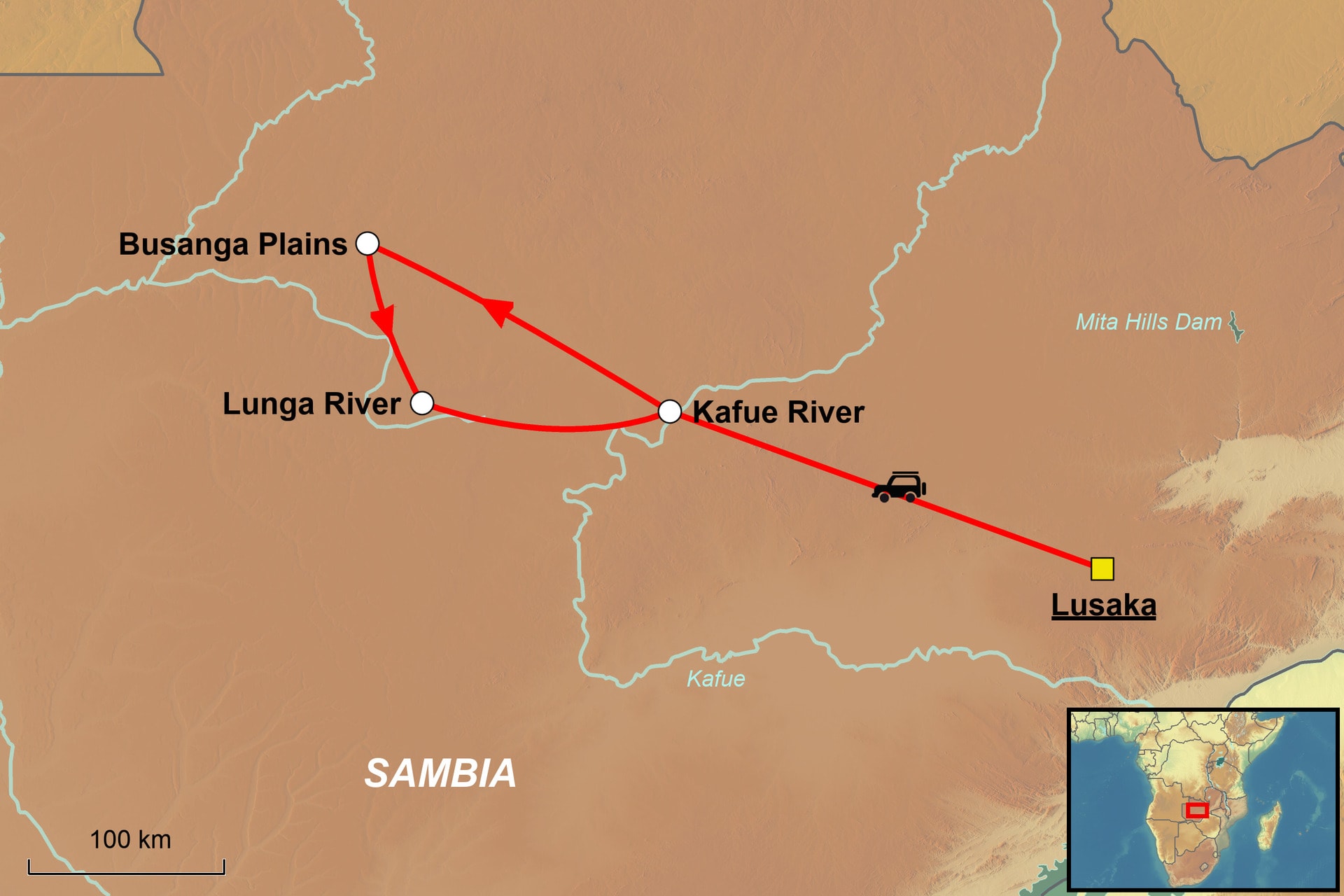 Tag 1: Lusaka – Kafue River ca. 270 km (A).
